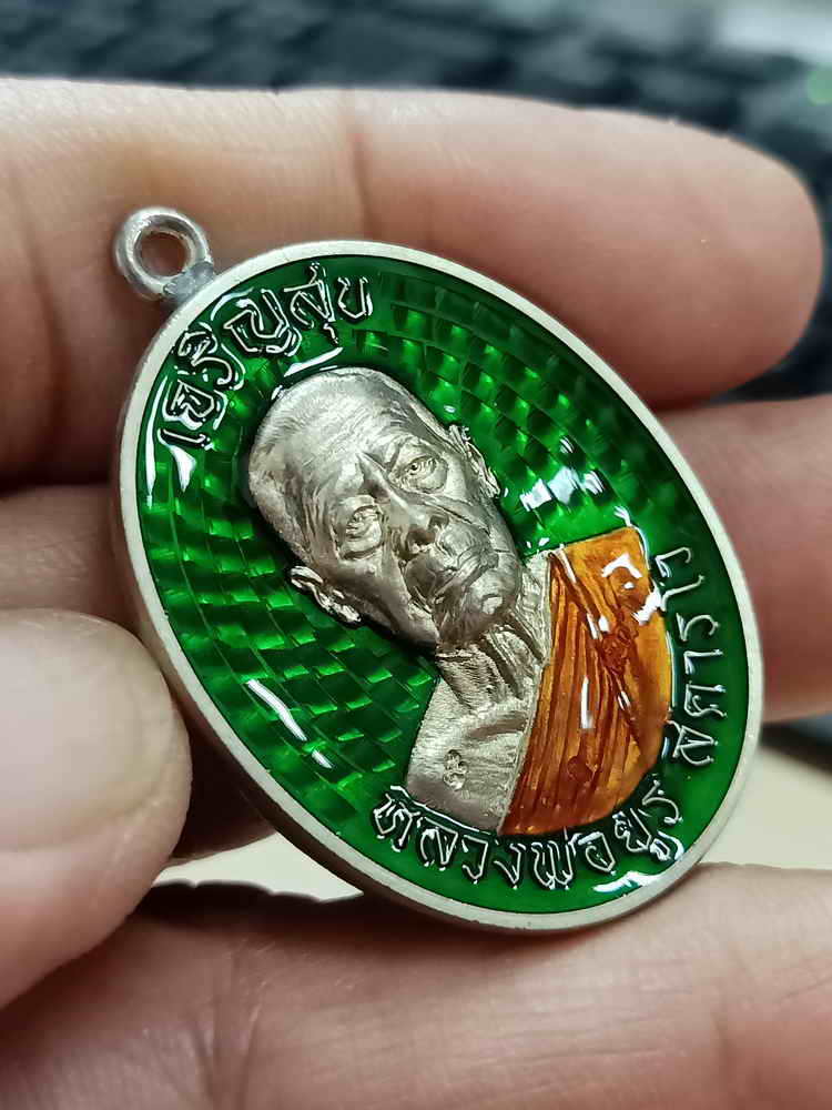 วัดใจ 100 PSGA เหรียญเจริญสุข งานบุญกฐิน หลวงพ่อยูร สคารโว วัดพนมเศษเหนือ จ.นครสวรรค์ ปี 2566 เนื้ออัลปาก้า ห่วงเชื่อมเงิน ลงยาเขียว จีวร ยันตื หมายเลข 69 กล่องเดิม ***ป๋องสุพรรณการันตี |