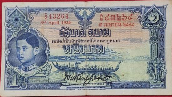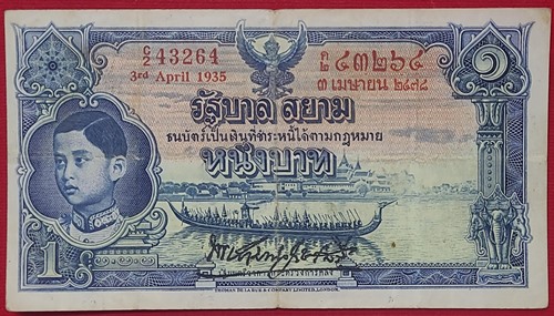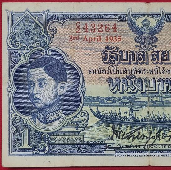 ธนบัตร 1บาท โทมัส รัชกาลที่ 8 เลขแดง หมายเลข 2C 43264-๒ค ๔๓๒๖๔ ลายเซ็น พระยามานวราชเสวี พิมพ์เมื่อ วันที่ 3 เมษายน 2478 ที่บริษัท โทมัส เดอ ลารู แอนด์ คัมปานี ลิมิเตด,ลอนดอน |