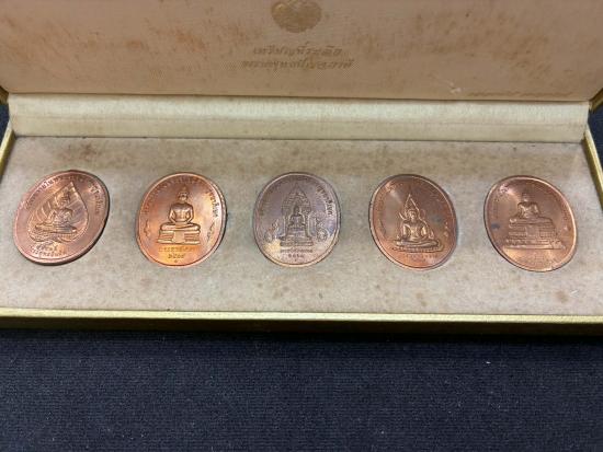 เหรียญที่ระลึก พระพุทธปัญจภาคี สร้างถวายในพิธีพระราชพิธีกาญจนาภิเษก ปี 2539 ประกอบด้วยเหรียญ พระมงคลบพิตร พระนิรันตราย พระพุทธชินราช พระพุทธชินสีห์ พระพุทธโสธร ด้านหลังรัชกาลที่ 9 พิธี ณ.วัดพระแก้ว |