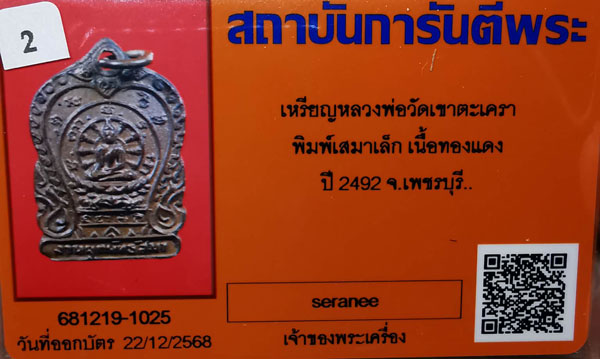 เหรียญหลวงพ่อวัดเขาตะเครา พิมพ์เสมาเล็ก เนื้อทองแดง ห่วงเดิม ปี2492 จ.เพชรบุรี + บัตรG-pra สภาพเดิมค่ะ |