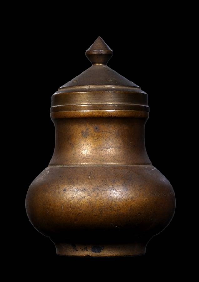 อูบทองเหลืองเก่า ภายในมีเม็ดคล้ายพระธาตุสีแดงชมพู สูง 2 นิ้วครึ่ง |
