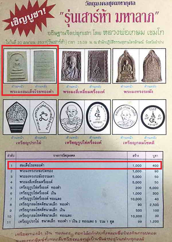 พระสมเด็จเสาร์ห้ามหาลาภ หลวงพ่อเกษม เขมโก ปี 2537 โรยผงตะไบทอง แช่น้ำมนต์ เนื้อผงเกสร จ.ลำปาง สมเด็จเกศทะลุซุ้ม |
