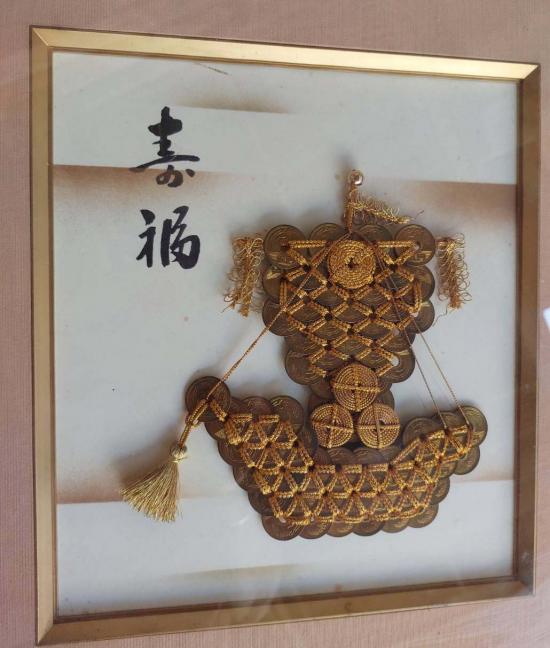 ***วัดใจ***เหรียญ 5 เยน ทำเป็นเครื่องรางนำโชค งานฝีมือแบบญี่ปุ่นดั้งเดิม โดยจัดเรียงเป็นรูปเรือใบ ประดับด้วยดิ้นสีทอง เพื่อความเป็นสิริมงคล |