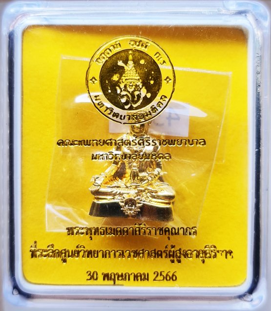 เป็นพระพุทธรูป ปางประทานพร ท่านั่งขัดสมาธิ พระพักตร์เป็นศิลปะสมัยสุโขทัย พระหัตถ์ขวาหงายขึ้น พระหัตถ์ซ้ายถือหม้อน้ำมนต์ วางบนหน้าตัก หน้า เบื้องล่างตรงกลาง มีตราสัญลักษณ์ งูพันคบเพลิง พร้อมตัวอักษร ศ ฐานด้านล่างด้านหลัง ข้อความ ศิริราช ๒๕๖๕ ใต้ฐานตอก ลำดับหมายเลขการผลิตและโค้ดสัญลักษณ์