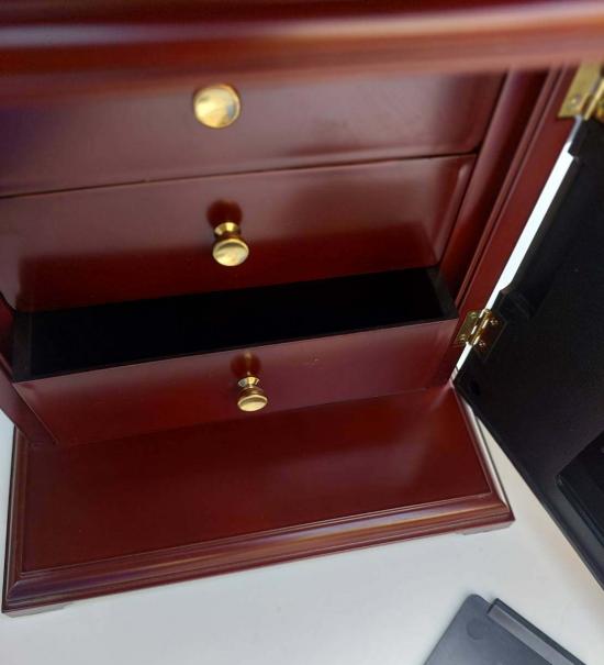 กล่องเครื่องประดับ 3 ลิ้นชัก พร้อมนาฬิกาตั้งโต๊ะ Miyabi สภาพสวย งาน Japan กว้าง 21 cm สูง 21 ใช้งานได้ปรกติ |