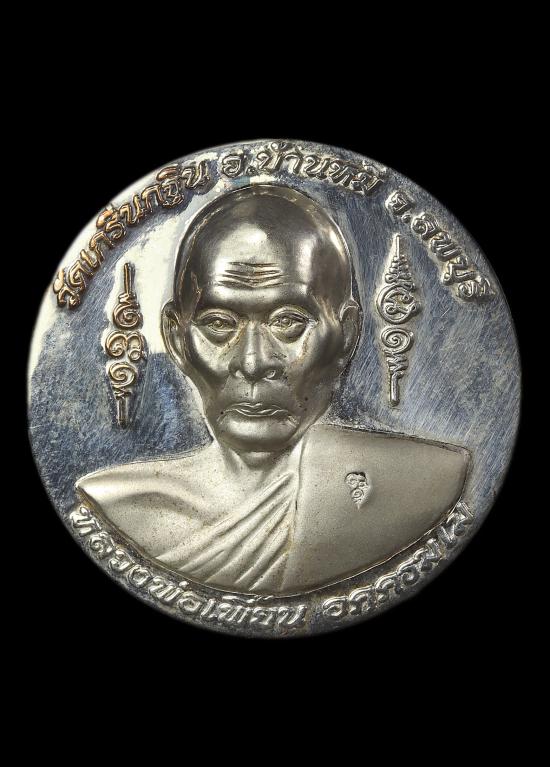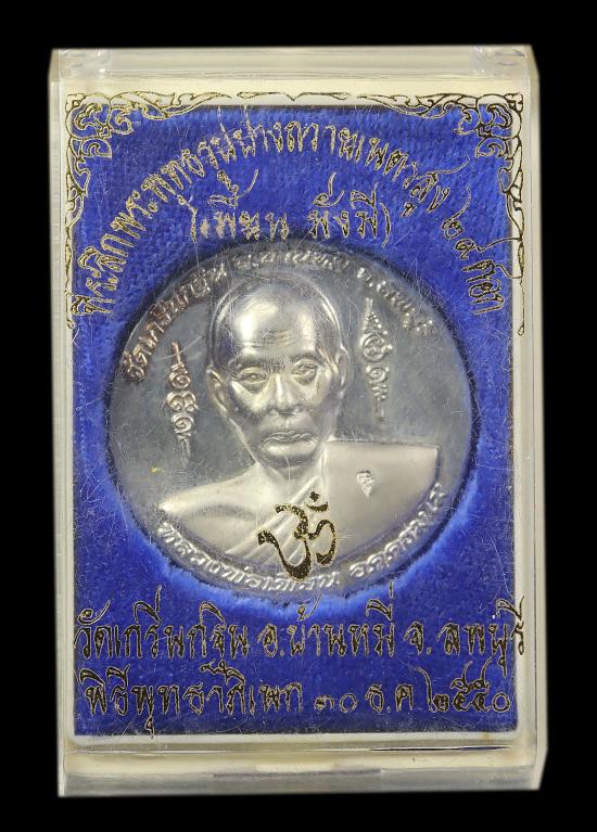 เหรียญหลวงพ่อเพี้ยน รุ่น เพี้ยนมั่งมี วัดเกริ่นกฐิน ปี 2550 ด้านหลังพระพิฆเนศ กะไหล่เงิน กล่องเดิม แดง120 |