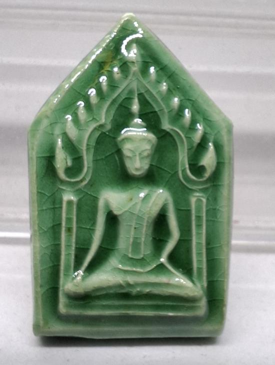 องค์นี้เป็นพระพิมพ์ขนาดจิ๋ว มีขนาด 1.7 X 2.7 c.m. เคลือบสีเขียวด้านหน้า หลังยันต์หมึก มาพร้อมกล่องเดิม