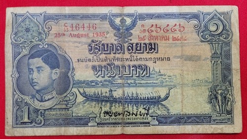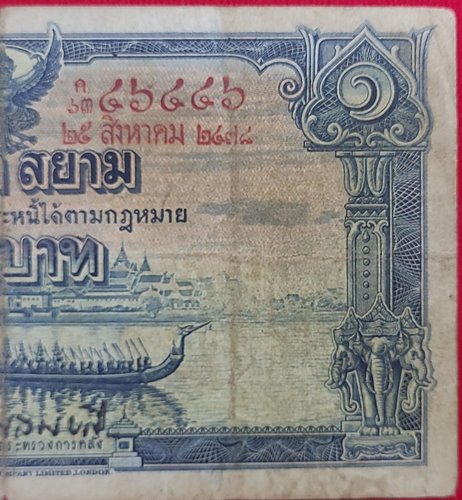 ธนบัตร 1บาท โทมัส รัชกาลที่ 8 หมายเลข 63C46446 - ๖๓ค ๔๖๔๔๖ ลายเซ็น พระยา ไชยยศสมบัติ พิมพ์เมื่อ วันที่ 25 สิงหาคม 2478 |