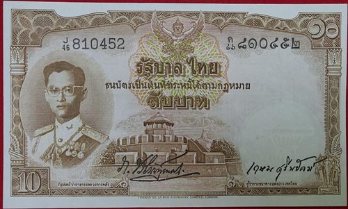 ธนบัตร 10 บาท โทมัส ในหลวงรัชกาลที่ 9 สภาพใหม่ ไม่ผ่านการใช้งาน ลายน้ำพานฯ หายาก หมายเลข 46J 810452-๔๖ด ๘๑๐๔๕๙ ลายเซ็น ภ.บริภัณฑ์ยุทธกิจ-เกษม ศรีพยัคฆ์ ขนาด 8.7 X 14.7 ซ.ม.ประกาศใช้เมื่อ วันที่ 25 พ.ย.2498 |