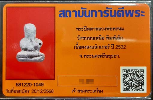 พระปิดตาหลวงพ่อพรหม พิมพ์เล็ก(กิมจ้อ) เนื้อผงลงแล็กเกอร์ ปี2532 วัดขนอนเหนือ จ.อยุธยา พร้อมบัตรรับรองครับ