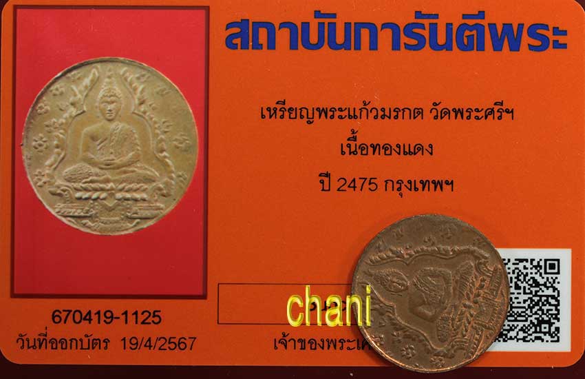 เหรียญ พระแก้วมรกต วัดพระศรีฯ พิมพ์หลังยันต์ลึก นิยม เนื้อทองแดง ปี2475 จ.กรุงเทพฯ สภาพสวยยังมีผิวไฟ หายาก พร้อมบัตรรับรองพระแท้จากจีพระอุ่นใจได้ ไม่ต้องลุ้นค่ะ