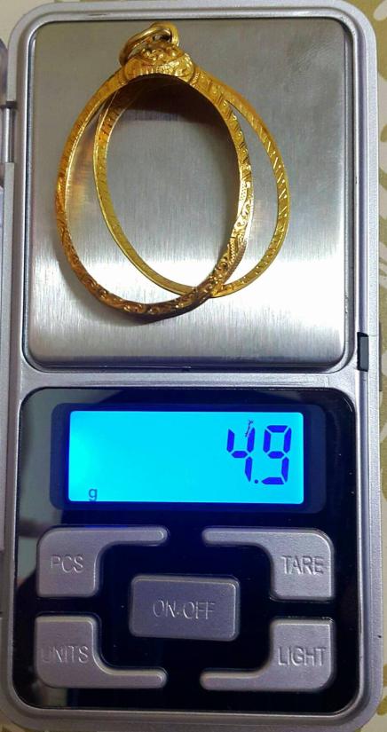 กรอบทองคำแท้ ทรงเหรียญรูปไข่ ยกซุ้มหัวสิงห์ น้ำหนักประมาณ 4.9 กรัม เปอร์เซ็นสูง 83.34%