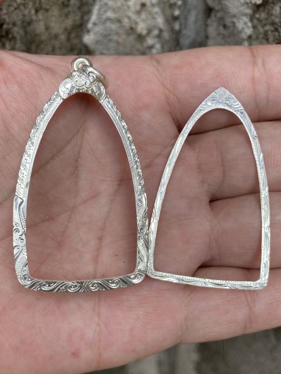 กรอบเงินแท้ สั่งทำมือ 2 เลี่ยมกันน้ำแล้วแกะออกไม่เคยผ่านการใช้ผ่านการคล้อง สภาพกรอบ 99% ไม่มีฉีดขาด |