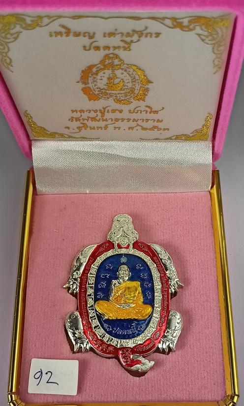 เหรียญ เต่ามังกรปลดหนี้ หลวงปู่เฮง ปภาโส วัดพัฒนาธรรมาราม จ.สุรินทร์ เนื้อเงินลงยา 3 สี เบอร์ 92 พร้อมกล่องเดิมครับ (เหรียญหนัก 30.91 กรัม)