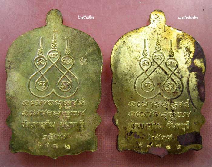 เหรียญนั่งพาน เนื้อทองเหลือง หลวงพ่อสมชาย วัดเขาสุกิม ตอกโค้ด ส และโค้ด จำนวน 2 เหรียญ หมายเลข ๖๕๗๒ และ ๑๔๗๓๒ ได้มาจากคนในพื้นที่