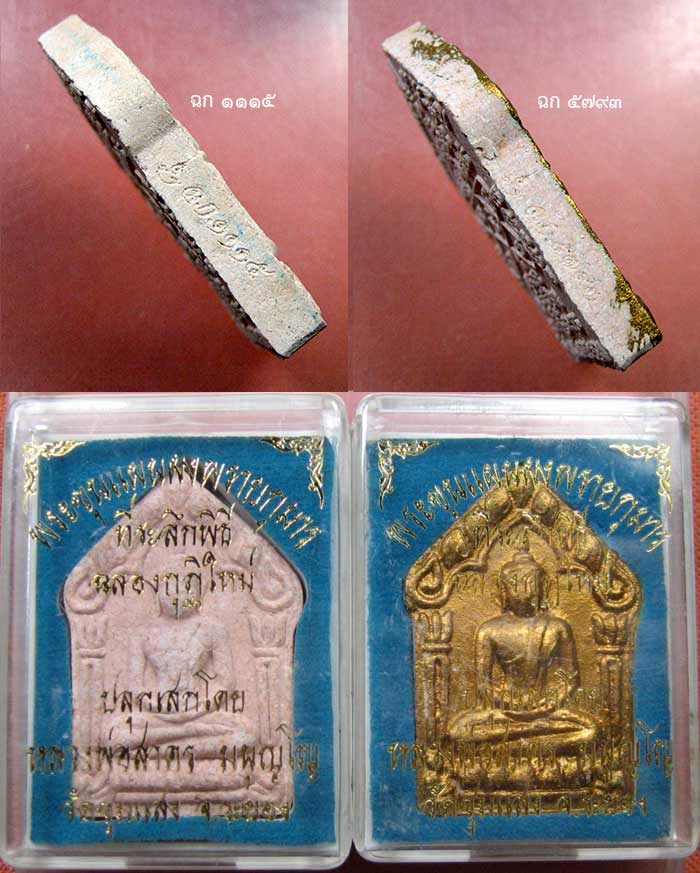 พระขุนแผนผงพรายกุมาร ที่ระลึกพิธีฉลองกุฎิ เนื้อชมพู ปี ๒๕๕๓ ไม่ทาทอง หมายเลข ๑๑๑๕ และทาทอง หมายเลข ๕๗๙๓ พร้อมกล่องเดิมๆ