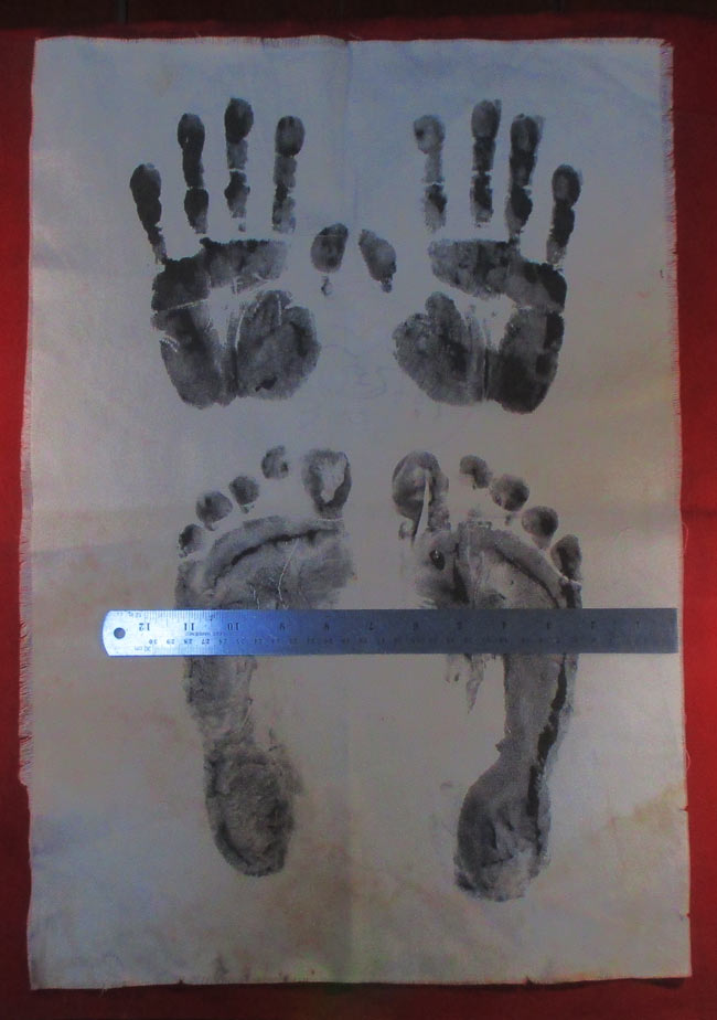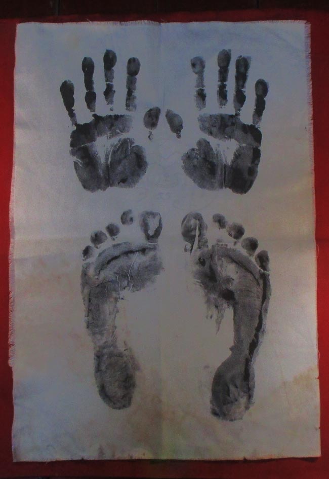 ผ้ายันต รอยมือ รอยท้าว ไม่ทราบที่ มีรอยจารยันต์ด้วยดินสอ ครับ (พระบ้าน ครับ) |