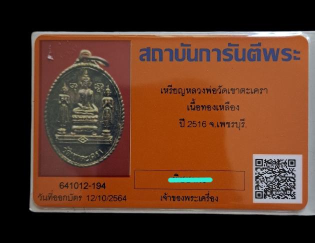 เหรียญหลวงพ่อวัดเขาตะเครา หลังยันต์ตาหมื่น จ.เพชรบุรี ปี 2516 สภาพสวยเดิม พร้อมบัตรับรอง G-PHA