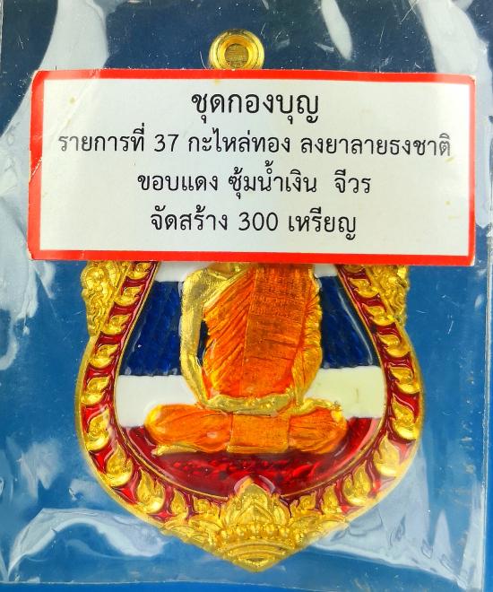 1300-เคาะเดียว เหรียญเสมาอุดมทรัพย์ พระอาจารย์ต้อม วัดท่าสะแบง ชุดกองบุญ เนื้อกะไหล่ทอง ลงยาธงชาติ ขอบแดง ชุ้มน้ำเงิน ลงยาจีวร เลข๑๓๔ เสมาใหญ่พิมพ์นิยม |