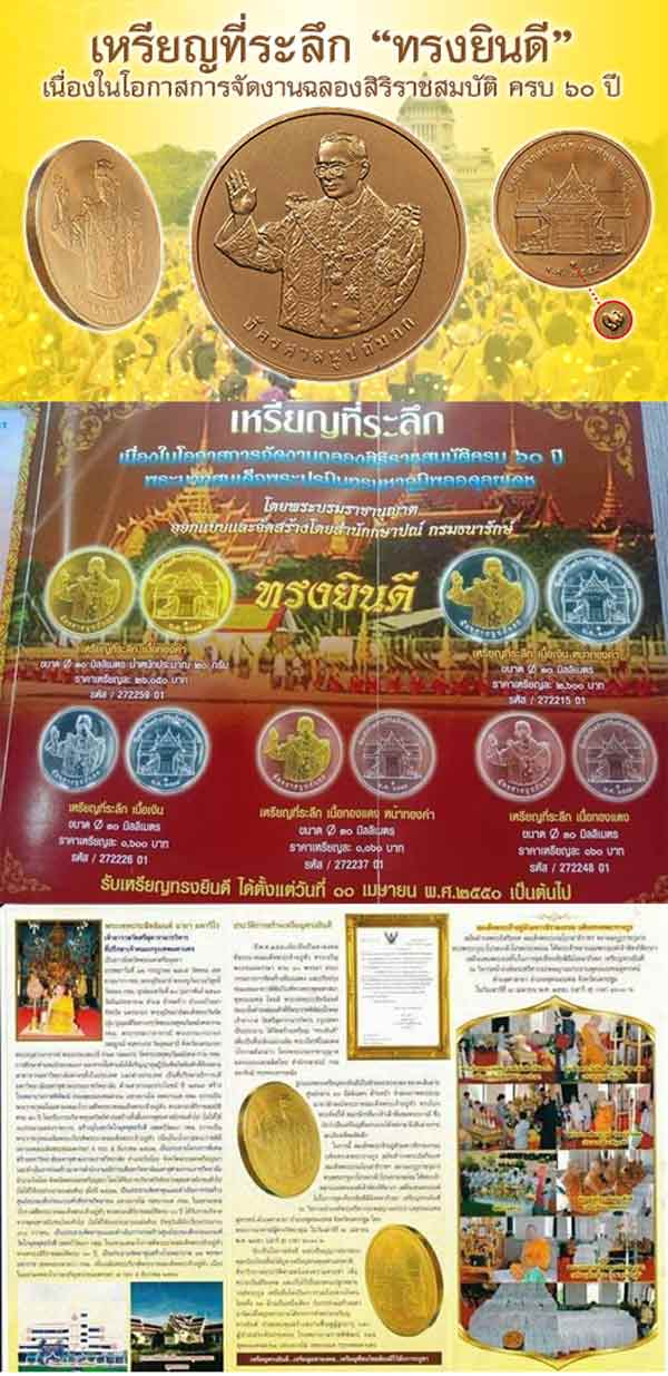 เหรียญทรงยินดี ในหลวง ร.9 เนื้อทองแดงขัดเงา ได้รับพระบรมราชานุญาตให้จัดสร้างขึ้นในปี พ.ศ.2549 โดยวัดศรีสุดาราม บางขุนนนท์ กทม. ออกแบบและผลิตโดยสำนักกษาปณ์ กรมธนารักษ์ กระทรวงการคลัง จ.น. 30 เหรียญ เนื |