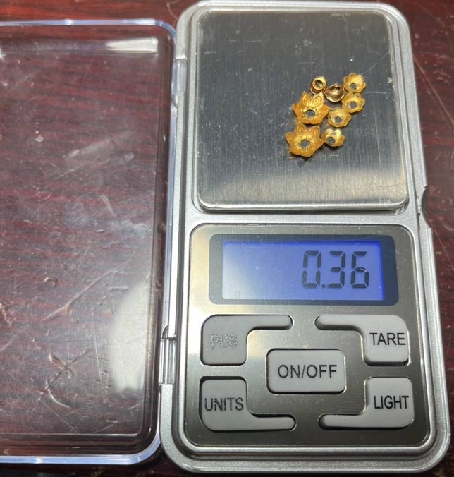 วัดใจ...ฝาครอบทองแท้ 3คู่ และ เม็ดทองแท้ 2เม็ด(ชำรุด1เม็ด)ขนาดตามรูป เป็นอะไหล่ร้อยสร้อยได้สบาย เปอร์เซ็นต์ดี ตามใบแจ้ง น้ำหนัก 0.36กรัม ครับ.