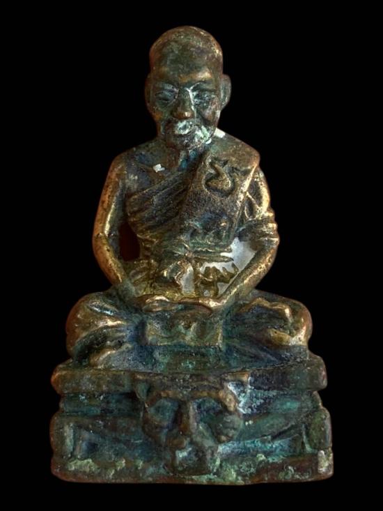 รูปหล่อหลวงพ่อเก่า ไม่ทราบที่ ลักษณะเป็นพระสงฆ์นั่งขัดสมาธิ งานหล่อโบราณ ทรงองค์สมส่วน ใบหน้ามีมิติ แสดงเอกลักษณ์งานเก่า ผิวผ่านการใช้งานยาวนาน มีคราบเก่า คราบสนิม และร่องรอยตามอายุธรรมชาติ เห็นการปิดทองเดิมหลงเหลือบางจุด เนื้อดูแห้งเก่า ไม่ผ่านการแต่งหรือขัดผิว สภาพตามการใช้งานจริง เหมาะสำหรับสายรูปหล่อเก่า สายสะสม หรือบูชาติดตัว