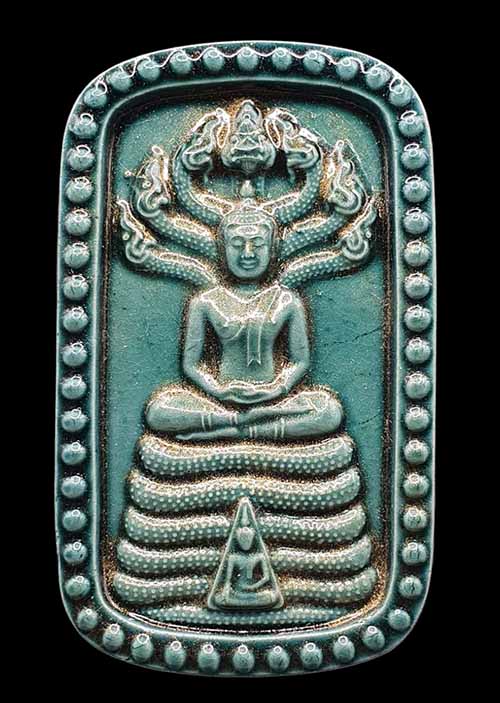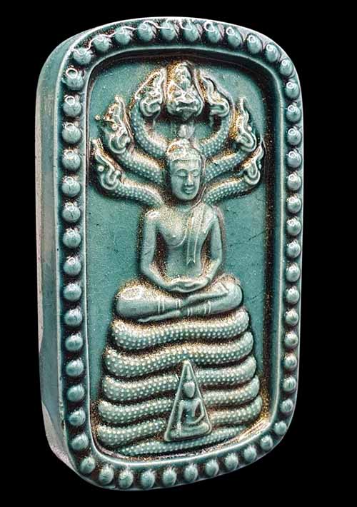 พระนาคปรกไตรภาคีศรีนคร ปี 2548 วัดนางตรา เนื้อกระเบื้องเคลือบ สีเขียว พิมพ์ใหญ่ กล่องเดิม