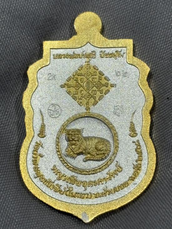 เหรียญเสมาพญาเสืออุดมทรัพย์ พระอาจารย์ประสูติ (หลวงพ่อประสูติ) วัดในเตา ตรัง เนื้อ2K องค์2K พื้นเงิน ขอบทอง หมายเลข62 |