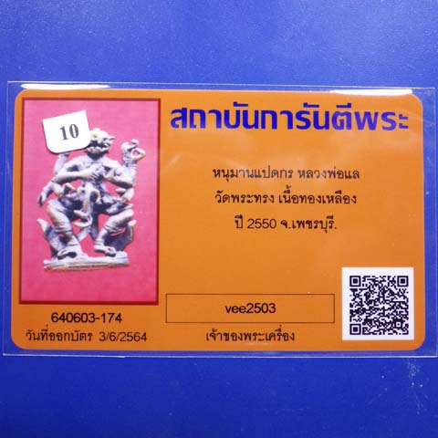 หนุมานหล่อโบราณ 8 กร รุ่นแรก เนื้อทองเหลือง หลวงพ่อแล วัดพระทรง จ.เพชรบุรี ปี 2550....10... 65.10.2 |