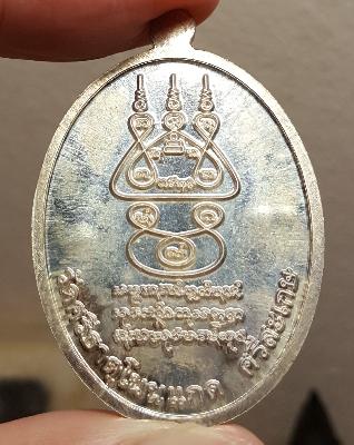 เหรียญรูปไข่เนื้อเงิน ผิวกระจก หลวงปู่เกลี้ยง วัดโนนแกด เศรษฐี ๑๐๗ ปี หมายเลข ๙๐ พร้อมกล่องเดิม