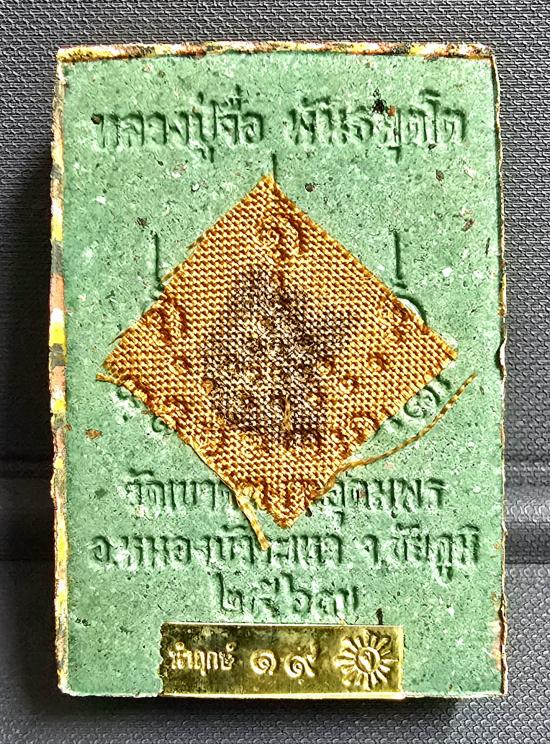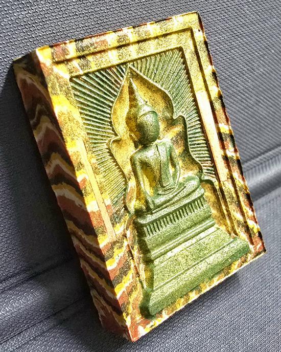 เนื้อสายรุ้งองค์เขียว ปัดทอง หลังมวลสาร,จีวร ตระกรุดทองแดง 2 ดอก พระปั้มคมชัด สวยมากๆๆครับ