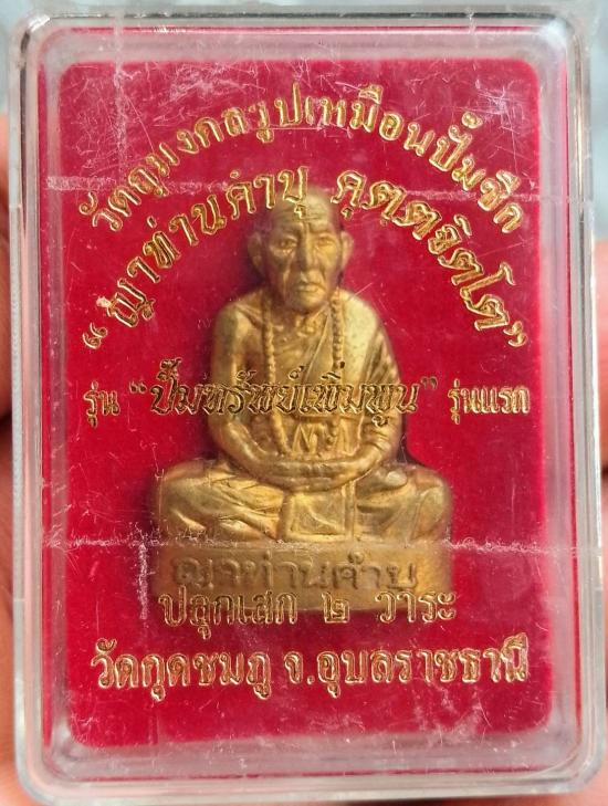 รูปเหมือนปั๊ม เนื้อทองเหลือง รุ่นปั๊มทรัพย์ เพิ่มพูน รุ่นแรก หลวงปู่คำบุ วัดกุดชมภู จ.อุบลราชธานี หมายเลข 46 พร้อมกล่องเดิม |