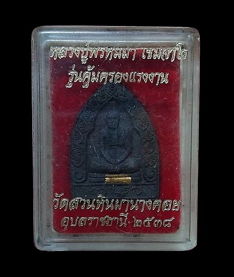 รูปเหมือน พิมพ์เจ้าสัว เนื้อว่าน 108 ผสมผงทองคำขาว ฝังตะกรุดทองคำ หลวงปู่พรหมมา เขมจาโร สำนักวิปัสสนาหินผานางคอย จ.อุบลราชธานี รุ่นคุ้มครองแรงงาน ปี 2538 พร้อมกล่องเดิม |