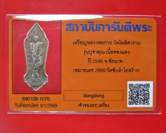 เหรียญหลวงพ่อกวย วัดโฆสิตาราม รุ่นบูชาคุณ เนื้อทองแดง ปี 2546 พร้อมบัตรรับรองพระแท้ หมายเลข 2886