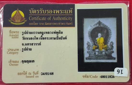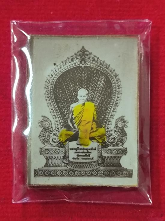 เคาะเดียวแดง รูปถ่ายแววนกยูง หลวงพ่อเดิม วัดหนองโพ เนื้อกระดาษปั๊มยันต์ มาพร้อมบัตรรับรองนิตยสารท่าพระจันทร์