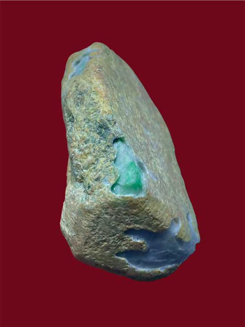ก้อนหยกดิบจากพม่า เจาะเอาเปือกเนื้อออก ส่องด้วยไฟแรงสูง มีสีเขียว และ ม่วงออกชมพู น้ำหนัก 452.7กรัม |