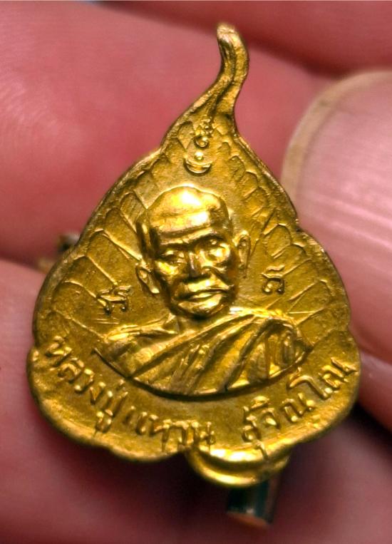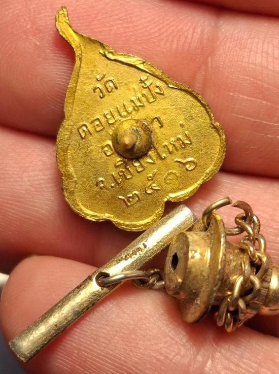 เข็มกลัดรูปใบโพธิ์ แบบมีตุ้งติ้ง รุ่นแรก หลวงปู่แหวน สุจิณโณ วัดดอยแม่ปั๋ง จ.เชียงใหม่ เนื้อโลหะกระไหล่ทอง สร้างปี 2516 สภาพสวยมาก หายากมาก |