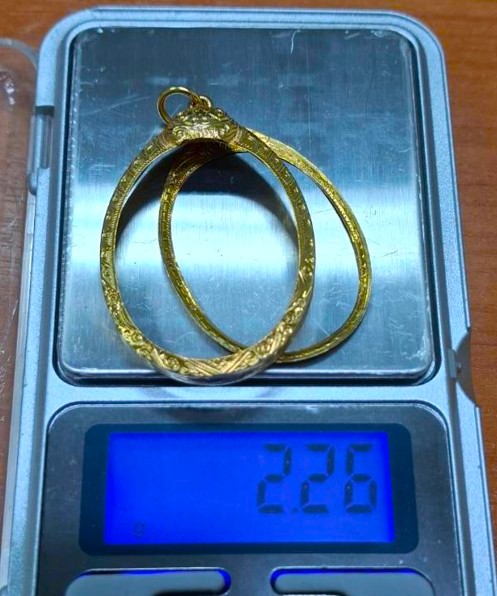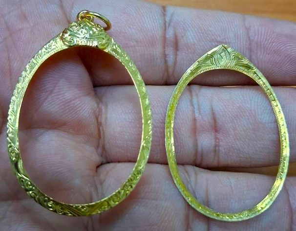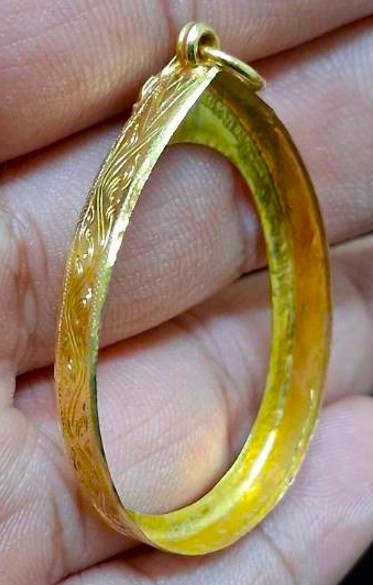 กรอบทองมือสอง สวยๆ ใส่เหรียญหลวงปู่ทวดรุ่น 2,4 และเหรียญทั่วไปที่ไกล้เคียง หน้าจอกว้าง 2.45 ซม., สูง 3.10 ซม. น้ำหนัก 2.26 กรัม เคาะเดียว