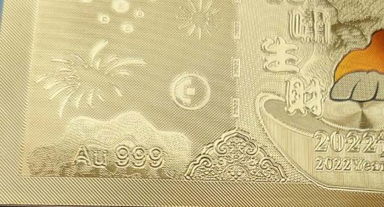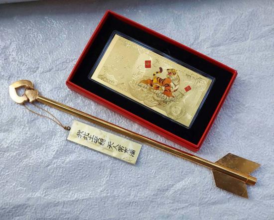 แผ่นการ์ดทอง ที่ระลึกปีเสือ 2022 กับ ลูกธนูศักดิ์สิทธิ์ของญี่ปุ่น ซึ่งเป็นเครื่องรางที่ใช้สำหรับปัดเป่าสิ่งชั่วร้ายและนำโชคดีมาให้ |