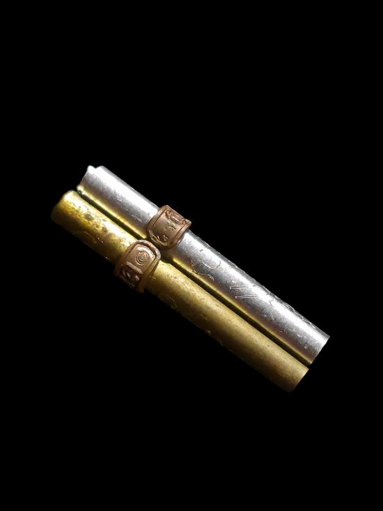 ตะกรุดเงินทองแมลงปอเรียกทรัพย์ (( สุวรรณมงคล ปี 48 ))หลวงพ่อทอง วัดสำเภาเชย ปัตตานี สภาพสวย พร้อมตลับ เคาะแรกถึงขั้นต่ำครับ เป็นแผ่นเงินแผ่นทองจารมือ ความยาว 2.5 เซน ขนาดน่าพกพาติดตัวไว้ค้าขายเรียกทรัพย์ (( ยันต์แมงปอเรียกทรัพย์ )) |