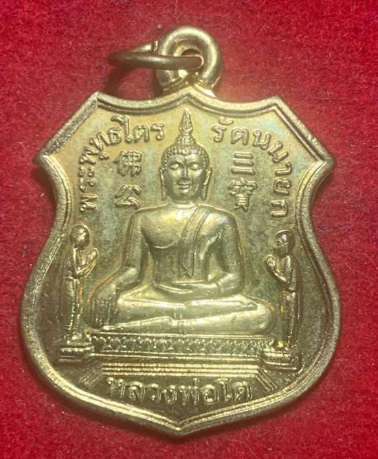 เป็นเหรียญอาร์มรูปทรงโล่ ด้านหน้าเป็นรูปจำลองหลวงพ่อโต (พระพุทธไตรรัตนนายก) ประทับนั่งปางมารวิชัยบนฐาน เชิญเคาะครับ |