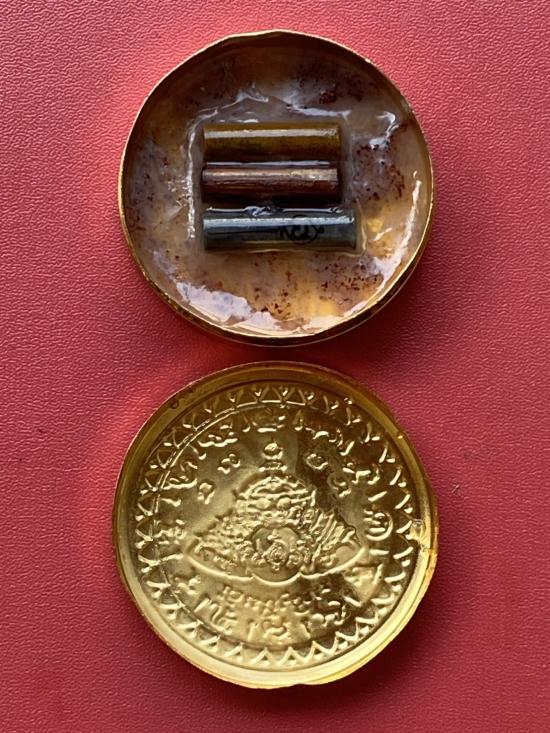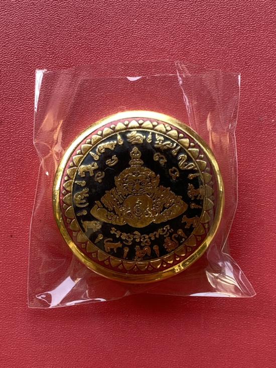 เคาะเดียวแดง สีผึ้งพระราหู รุ่น มงคลจักรวาล เนื้อ โลหะชุบทองลงยาสีดำขอบสีแดง ขนาด5ซม