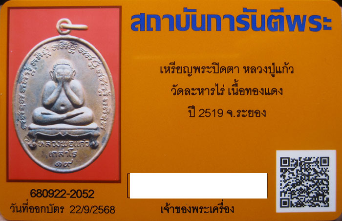 เหรียญปิดตาหลวงพ่อแก้ว เกสาโร เนื้อทองแดง สภาพสวย พร้อมบัตรรับรอง
