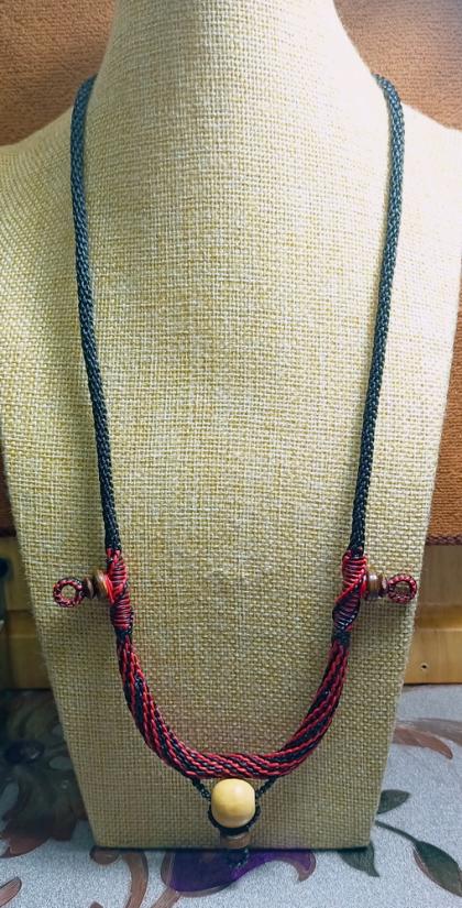 สร้อยคอเชือกเทียน งานถักมือ ( สีดำ-แดงเข้ม + แซมลูกปัดไม้ธรรมชาติ ห้อยพระ 3 องค์+หลัง 1 องค์ ) ยาว24 นิ้ว ครับ |