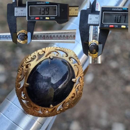 แหวนประดับพลอยสตาร์แซฟไฟร์ นิหล่า เนื้อเทียนแบบดิบ (ไม่ผ่านการเผา) ฉลุลายแบบโบราณแบบหัวมอญ พลอยมีขนาดประมาณ 13.9 x 10.7 มิลลิเมตร ตัวเรือน โลหะชุบทอง