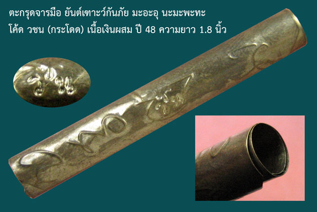 ตะกรุดจารมือ ยันต์เฑาะว์กันภัย มะอะอุ นะมะพะทะ ตอกโค้ด วชน เนื้อเงินผสม ปี 48 ความยาว 1.8 นิ้ว ***เคาะเดียว*** |