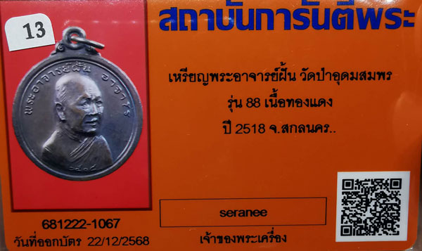 เหรียญพระอาจารย์ฝั้น วัดป่าอุดมสมพร รุ่น88(กรมป่าไม้ ตอกโค๊ต) เนื้อทองแดง ห่วงเดิม ปี2518 จ.สกลนคร + บัตรG-pra สภาพสวยเดิมค่ะ |