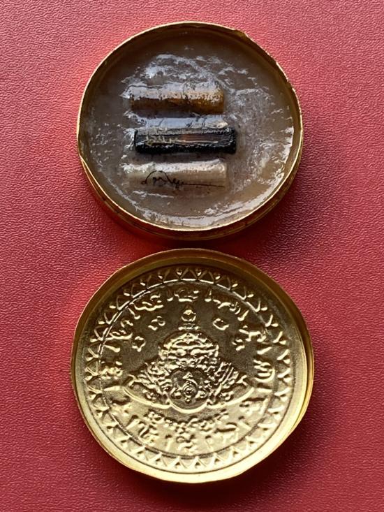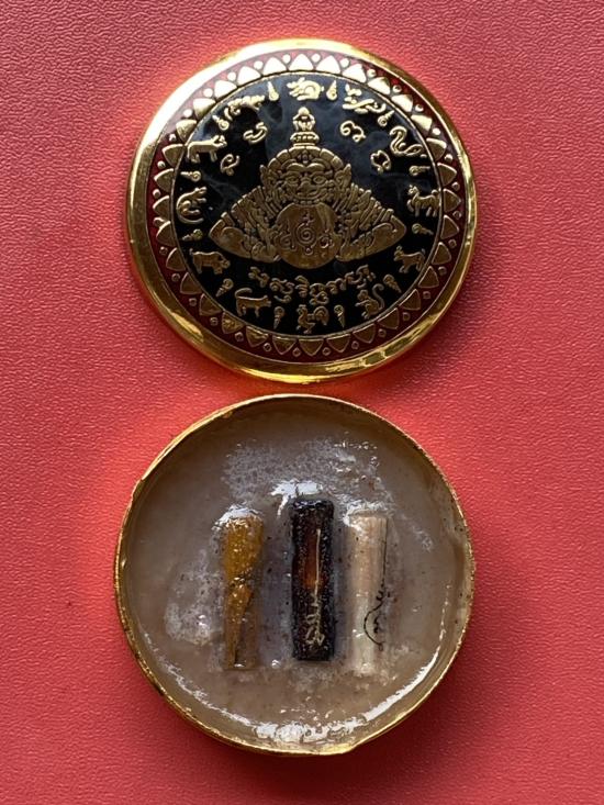 เคาะเดียวแดง สีผึ้งพระราหู รุ่น มงคลจักรวาล เนื้อ โลหะชุบทองลงยาสีดำขอบสีแดง ขนาด5ซม |