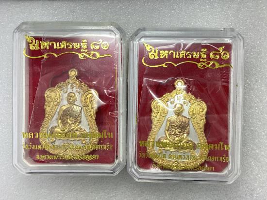 เหรียญรูปเหมือน หลังหนุมาน8กรขี่สิงห์ รุ่น มหาเศรษฐี๘๐ หลวงพ่อเอื้อน วัดวังแดงใต้ จ.พระนครศรีอยุธยา เนื้อโลหะชุบ สามกษัตริย์ กล่องเดิม ( 2 เหรียญ ) |