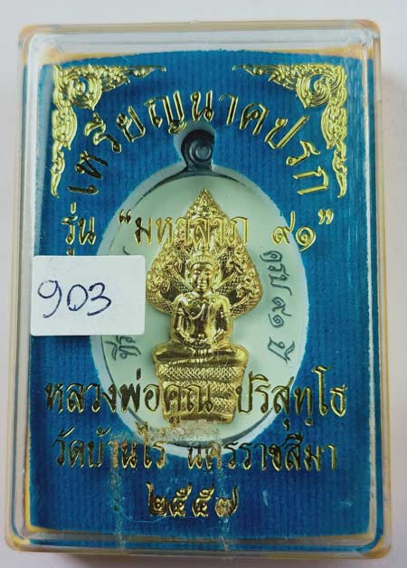เหรียญนาคปรก หลวงพ่อคูณ มหาลาภ91 เนื้อชินตะกั่วหน้ากะไหล่ทองลงยาลงยาสีขาว เบอร์ 903 พร้อมกล่องครับ